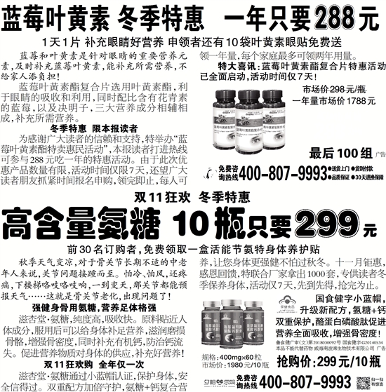 为感谢广大读者的信赖和支持,特举办“蓝莓叶黄素酯特卖惠民活动”,本报读者打进热线可参与288元吃一年的特惠活动。由于此次优惠产品数量有限,活动时间仅限7天,还望广大读者朋友抓紧时间报名申购,领完即止,每人可领一年量,每个家庭最多可领两年用量。