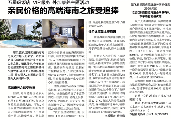 目前,海南游的价格从人均3000元至5000元不等,时间也从8日至30日不等,价格之间差距还是挺大的。不过,相比以往的海南游以低价为卖点,今年的海南游多了不少高端产品,且较受欢迎。例如浙江省中青旅推出的海南琼海8日游,中国东方航空执飞的双飞,入住君澜酒店集团旗下的琼海博鳌和悦景澜海景度假酒店。住着豪华海景房,且拥有五星物业服务,入住就能享受到六大VIP服务,有管家随传随到,早晚餐都是由养生专家精心设计的自助餐。