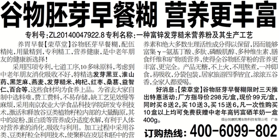 好消息:【荣草堂】谷物胚芽早餐糊限时三天推出特惠活动:厂方指导价298元/盒,现价99元/盒,同时买8送2,买10送3,买15送6,凡一次性购买10盒以上均可免费获赠中老年高钙富硒羊奶一盒400g。