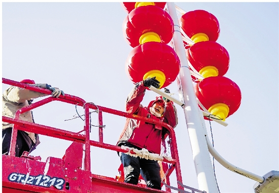 衢州市智慧新城九华北大道上,工人们在悬挂灯笼。胡江丰 摄