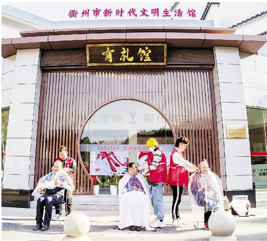 几名志愿者为衢州市柯城区府山街道坊门街社区的几位老人理发。水工 摄