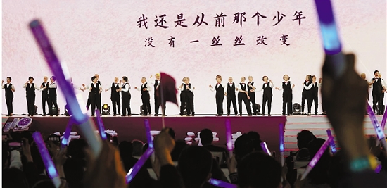 4月25日,在清华大学110周年校庆联欢晚会上,上海校友会艺术团表演歌曲联唱《你我皆少年》。