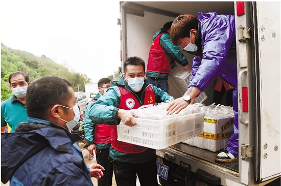 3月23日,在广西梧州市藤县埌南镇莫埌村,工作人员在为救援人员搬运餐食。 据新华社