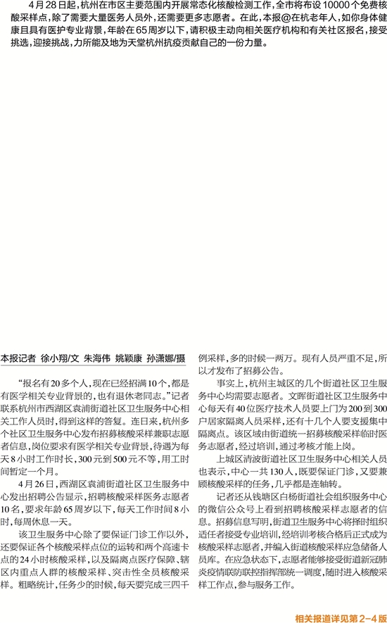 4月28日起,杭州在市区主要范围内开展常态化核酸检测工作,全市将布设10000个免费核酸采样点,除了需要大量医务人员外,还需要更多志愿者。在此,本报@在杭老年人,如你身体健康且具有医护专业背景,年龄在65周岁以下,请积极主动向相关医疗机构和有关社区报名,接受挑选,迎接挑战,力所能及地为天堂杭州抗疫贡献自己的一份力量。