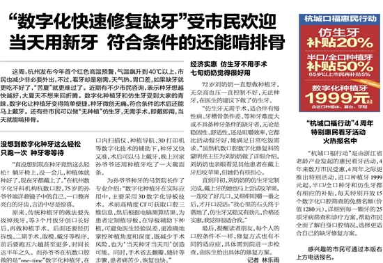 这周,杭州发布今年首个红色高温预警,气温飙升到40℃以上,市民也减少非必要外出,不过,看牙却是刚需,天气热,胃口差,如果缺牙就更吃不好了,“苦夏”就更难过了。近期有不少市民咨询,表示种牙想越快越好,大夏天不想来回折腾。数字化种植牙和仿生牙受到大家的青睐,数字化让种植牙变得简单便捷,种牙微创无痛,符合条件的术后还能马上戴牙。还有些市民可以做“无种植”仿生牙,无需手术,即戴即用,当天就能啃排骨。