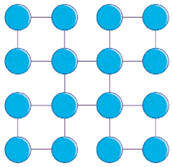 把1-16这些数字填入图中的16个圈内,使图中5个正方形的4个顶点上数字之和相等。
