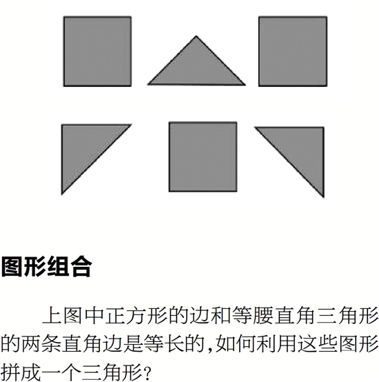 上图中正方形的边和等腰直角三角形的两条直角边是等长的,如何利用这些图形拼成一个三角形?