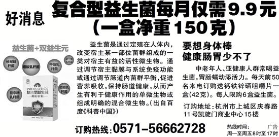 中老年人、亚健康人群常喝益生菌,胃肠蠕动添活力。每天前50名来电订购送钙铁锌硒咀嚼片一盒(42克)。每人限购6盒益生菌。