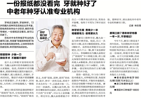 今年7月,摩耳口腔迎来7周年院庆。为回馈杭州市民多年来的支持和厚爱,摩耳口腔特别给70岁及以上的老年人送出一份福利,种植牙低至980元/颗。由于只开放50颗,活动开启当天便报名额满,很多市民来电表达预约不到的遗憾。摩耳口腔决定,将“980元种植牙”预约时间延长至7月31日,未报名的市民请抓紧时间拨打本版右上方专线。