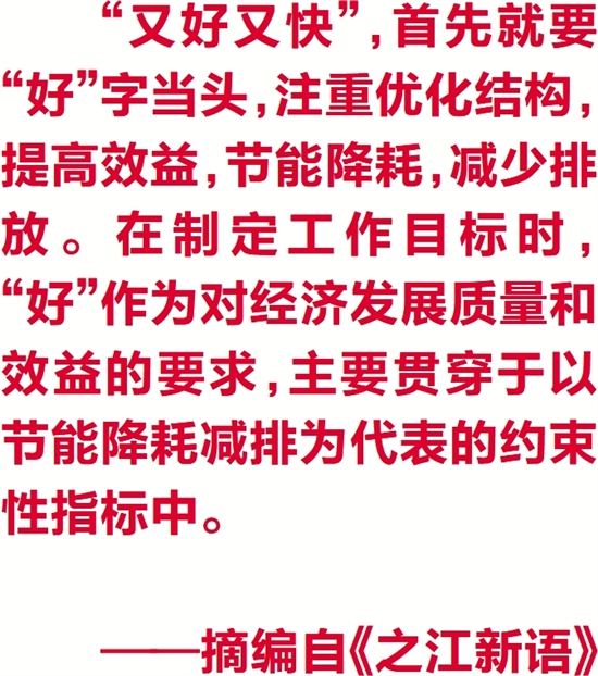 “又好又快”,首先就要“好”字当头,注重优化结构,提高效益,节能降耗,减少排放。在制定工作目标时,“好”作为对经济发展质量和效益的要求,主要贯穿于以节能降耗减排为代表的约束性指标中。