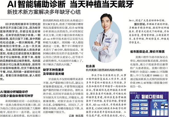 和周阿姨住在同一小区的赵大爷一直鼎力推荐杭州美奥口腔,因为他自己曾在这家医院做了几颗种植牙,现在牙口一直不错。这让周阿姨和家人看到希望。杭州美奥口腔西湖机构技术院长杜永涛通过口腔CBCT技术,检查了周阿姨牙槽骨情况及重要组织位置,结合AI智能分析系统出具的报告,针对性制定术区方案,只需少量自体骨再配合all-on-4种牙技术就可以实现当天种植当天戴牙。周阿姨一家人都很满意这一方案。整个半口种植牙手术进行了40分钟,做得很成功。周阿姨拉着杜院长的手连连称赞:“可以用自己的骨头更安心,还节省不必要的费用,当天就把牙齿戴上了,终于解决了我的大问题。”