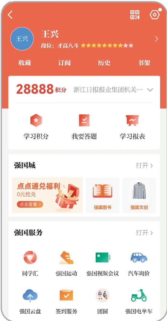 点击“学习强国”主界面右上方“我的”,即可查看学习积分和点点通。