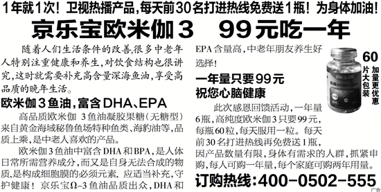 此次感恩回馈活动,一年量6瓶,高纯度欧米伽3只要99元,每瓶60粒,每天服用一粒。每天前30名打进热线再免费送1瓶,因产品数量有限,身体有需求的人群,抓紧申购,每人可购一年量,每个家庭可购两年用量。