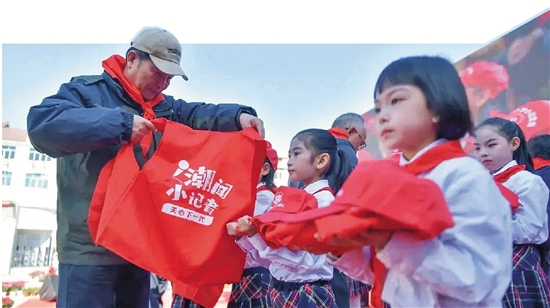 老同志为“飘萍小记者”颁发“记者证”“小记者红马夹”。
