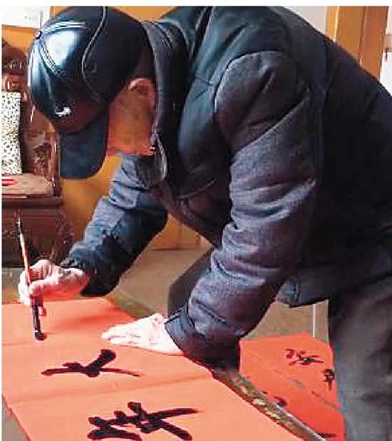 新晋百岁老人施连庆给村里人写春联。