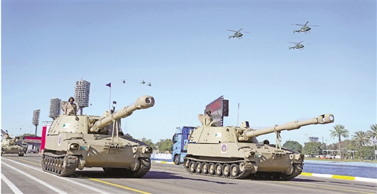 1月6日,伊拉克举行阅兵式,庆祝建军103周年。图为当日,在伊拉克首都巴格达,自行榴弹炮和直升机参加庆祝建军103周年的阅兵式。