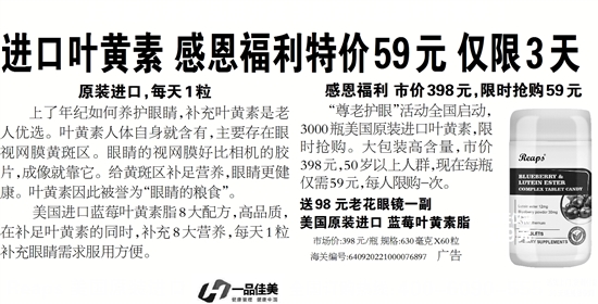 “尊老护眼”活动全国启动,3000瓶美国原装进口叶黄素,限时抢购。大包装高含量,市价398元,50岁以上人群,现在每瓶仅需59元,每人限购-次。