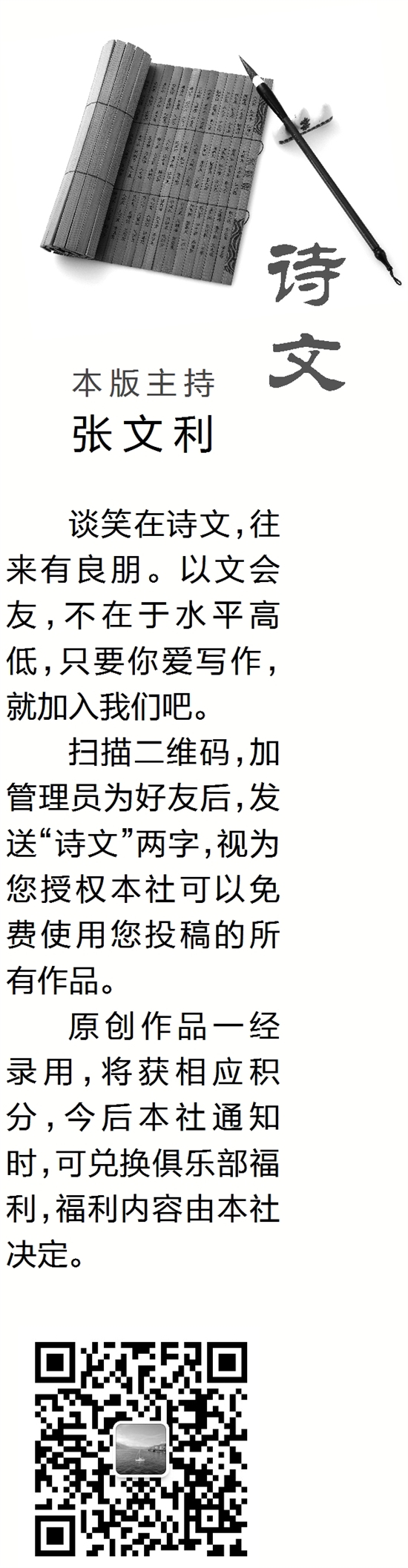 扫描二维码,加管理员为好友后,发送“诗文”两字,视为您授权本社可以免费使用您投稿的所有作品。