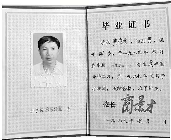 韩伟定电大毕业证书 受访者供图