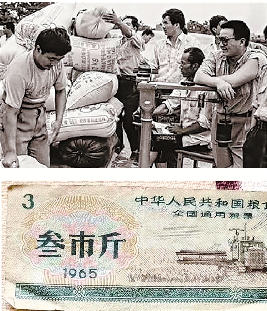 上图为上世纪70年代初,粮站收购粮食。下图为全国通用粮票。 受访者供图