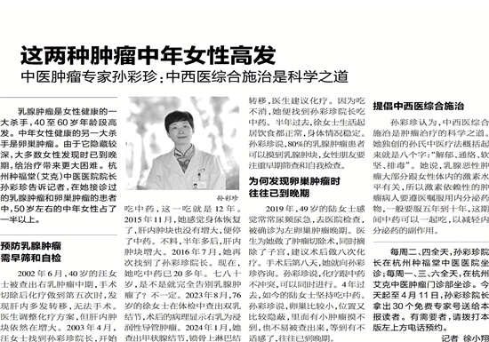 乳腺肿瘤是女性健康的一大杀手,40至60岁年龄段高发。中年女性健康的另一大杀手是卵巢肿瘤。由于它隐藏较深,大多数女性发现时已到晚期,给治疗带来更大困难。杭州种福堂(艾克)中医医院院长孙彩珍告诉记者,在她接诊过的乳腺肿瘤和卵巢肿瘤的患者中,50岁左右的中年女性占了一半以上。