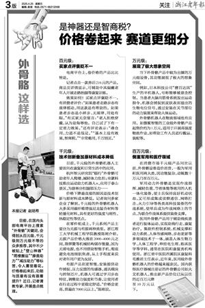 医用外骨骼产品用于辅助残疾患者进行肢体运动,实现助残行走、康复治疗。集软件控制系统、机械支撑和动力系统、人体传感网络、步态更新等多领域技术于一体,涵盖人体生物力学、人体工程学、神经电生理、临床医学等学科,通常在医院和康复类机构使用。浙江省中医院西溪院区康复科毛雅君主任表示,近年来,医用级外骨骼机器人的价格越来越亲民。国内获得医疗器械注册证的外骨骼公司如大艾机器人,推出新产品价位已从以往的近百万元降至10万元以下。