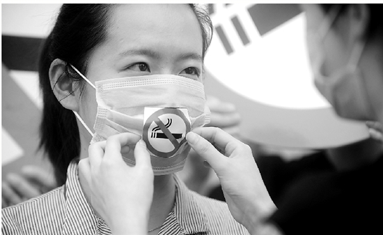 2018年5月31日,江苏省扬州市控烟志愿者在街头用行为艺术的方式劝市民戒烟。