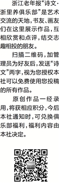 浙江老年报“诗文·浙里养俱乐部”是艺术交流的天地,书友、画友们在这里展示作品,互相欣赏和点评,结交志趣相投的朋友。
