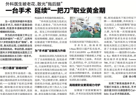 显微镜下需要频繁调节焦距,手术时出现短暂视物模糊,夜间或强光下视力明显下降……陈鼎提醒,外科医生一旦出现以上情况需警惕“职业视力危机”。 “建议45岁以上人群,每年做一次眼健康检查。外科医生更需优异视觉,这是维护患者生命安全的基本配置。”温州医科大学附属眼视光医院之江眼科已经引进了全球最尖端的眼科手术导航系统——德国蔡司Callisto Eye 精准手术导航系统,搭配高端手术显微镜 Lumera 700,开启了精准屈光晶体手术时代。近三年来,已有13位医生通过此类手术重返精准医疗一线,延续职业生涯的黄金时期。 记者 徐小翔