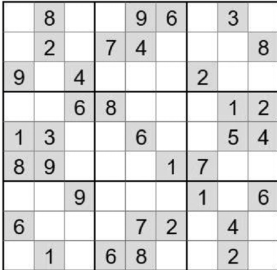 在空白格填入数字,使其每行、每列、每一个粗线格(3×3)内的数字为1-9,不重复。