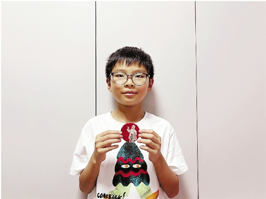 张铂晨和家里像章的合影。 受访者供图
