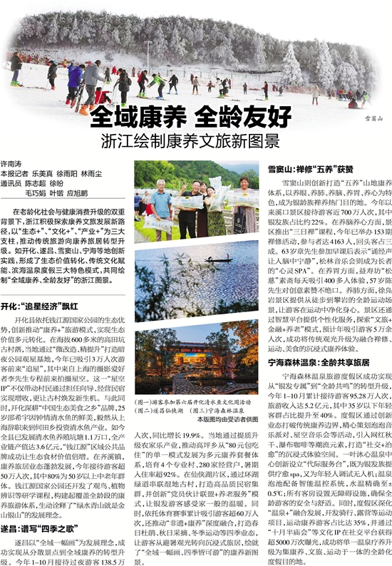 在老龄化社会与健康消费升级的双重背景下,浙江积极探索康养文旅发展新路径,以“生态+”、“文化+”、“产业+”为三大支柱,推动传统旅游向康养旅居转型升级。如开化、遂昌、雪窦山、宁海等地创新实践,形成了生态价值转化、传统文化赋能、滨海温泉度假三大特色模式,共同绘制“全域康养、全龄友好”的浙江图景。