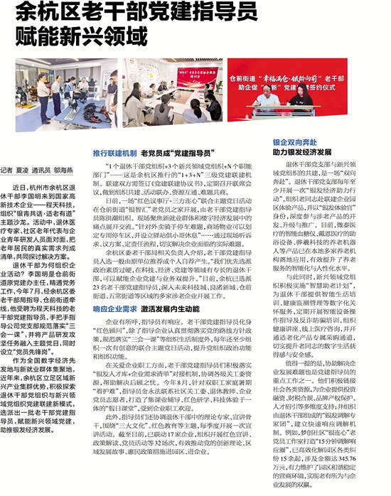 作为全国数字经济先发地与新就业群体集聚地,近年来,余杭区立足区域新兴产业集群优势,积极探索退休干部党组织与新兴领域党组织党建联建新模式,选派出一批老干部党建指导员,赋能新兴领域党建,助推银发经济发展。