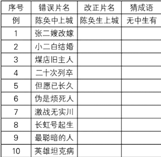 这是一道妙趣横生的文字游戏,已知图表中的错误片名中,每部影片名都有一个错字,请你改正片名后,根据意思填出一句成语。