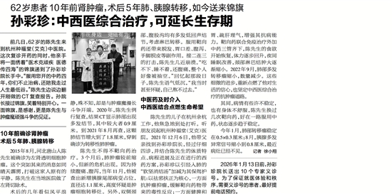 今年1月,肺部转移瘤稳定在0.5×0.3厘米;8月,胰腺多发异常信号缩小到0.8厘米,最近病灶已经不见。 记者 徐小翔