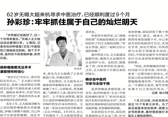 “因此,在肿瘤确诊的第一时间就可以看中医、用中药。患者一定要有耐心和决心,尤其是已经出现转移的患者,不要随随便便停药。”孙院长表示,“不要轻言放弃,要牢牢抓住属于自己的灿烂明天。” 记者 徐小翔