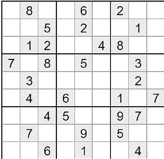 在空白格填入数字,使其每行、每列、每一个粗线格(3×3)内的数字为1-9,不重复。