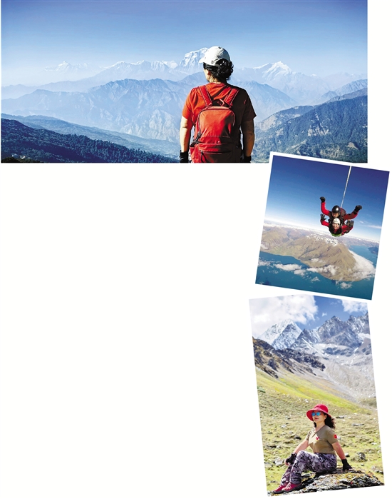 (图片由上至下)张小玲在尼泊尔徒步旅行;在新西兰跳伞;在丽江徒步旅行。 受访者供图