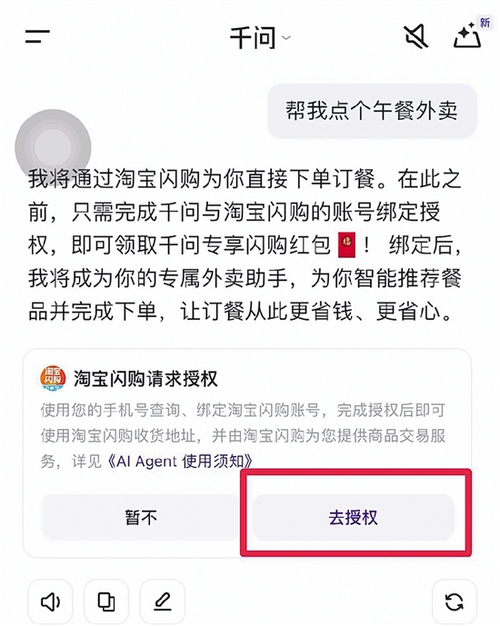 使用AI点外卖需要授权绑定“淘宝闪购”。
