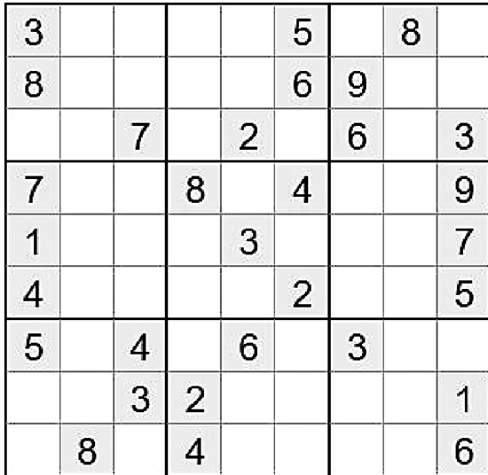 在空白格填入数字,使其每行、每列、每一个粗线格(3×3)内的数字为1-9,不重复。