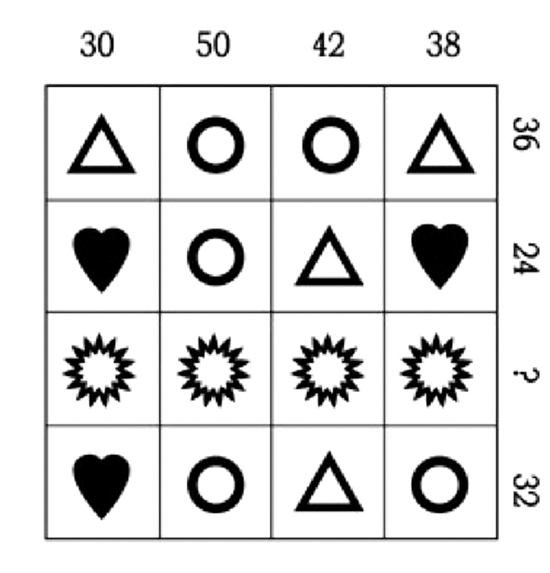图中的每一种符号均代表一定数值。请问右侧的问号处应为什么数字?