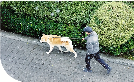 在家从窗户往外看,惊喜地发现杭城降下了今年第一场雪。拿起相机准备拍雪景,看到下面有人在雪中遛狗,一人一狗颇有意趣,便拍下了这张照片。 戴国凤