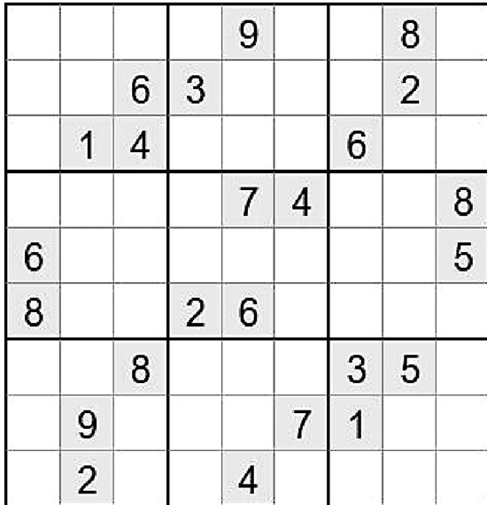 在空白格填入数字,使其每行、每列、每一个粗线格(3×3)内的数字为1-9,不重复。