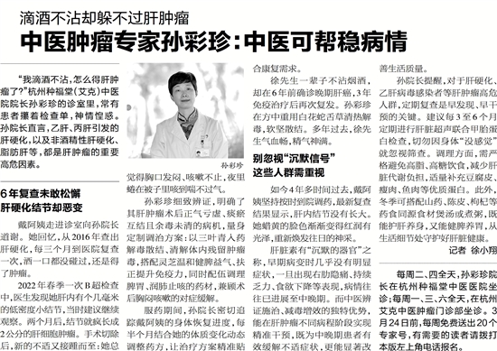 每周二、四全天,孙彩珍院长在杭州种福堂中医医院坐诊;每周一、三、六全天,在杭州艾克中医肿瘤门诊部坐诊。3月24日前,每周免费送出20个专家号,有需要的读者请拨打本版左上角电话报名。