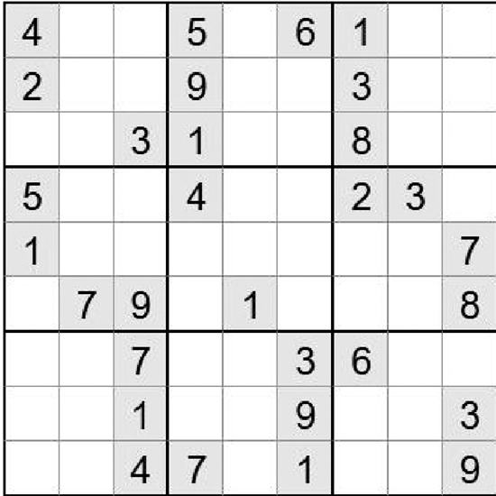 在空白格填入数字,使其每行、每列、每一个粗线格(3×3)内的数字为1-9,不重复。