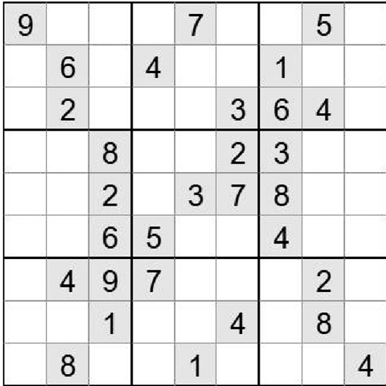 在空白格填入数字,使其每行、每列、每一个粗线格(3×3)内的数字为1-9,不重复。