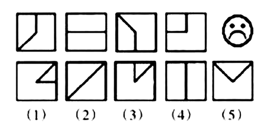 仔细观察下面的图形,找出规律说出(1)(2)(3)(4)(5)这五个图形中,哪一个应该填在图中的脸谱位置。